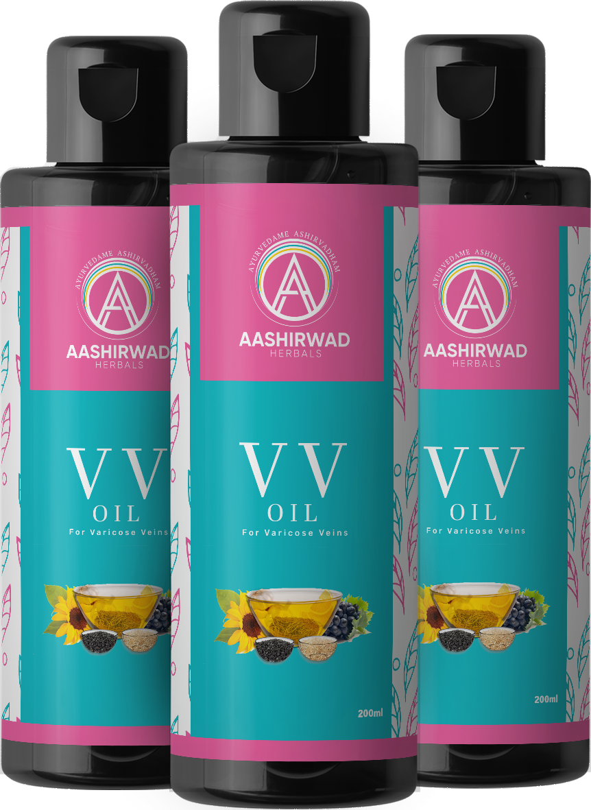 Varicose veins are enlarged, swollen, and twisting veins, often appearing blue or dark purple. They are caused when faulty valves in the veins allow blood to flow in the wrong direction. AASHIRWAD VV Oil has been formulated to relieve swelling, bruises or pain from varicose veins or spider veins. It also reduces the heavy feeling in the legs. It is safe to apply and has no side effects.